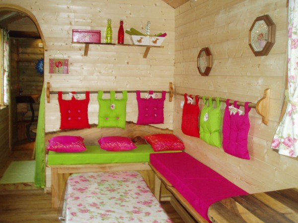 - Roulotte tzigane réalisée avec 20 essences de bois différentes, isolation en chanvre, terrasse avec vue sur les chevaux, cuisine équipée, grande douche, lit en alcôve.