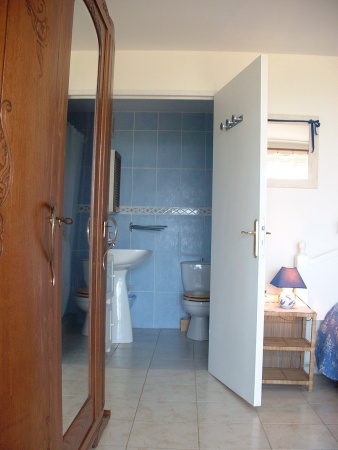 La chambre bleue (16 m²) est confortable et décorée dans les tons blancs / bleus, 2 matelas neufs 5 zones, 90x200, salle d’eau/wc privatifs… Vous y accéderez par la large baie vitrée donnant plein sud-ouest qui s’ouvre sur la terrasse aménagée privée.