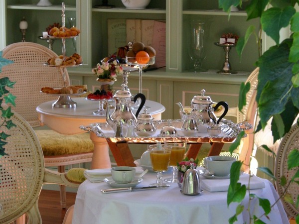 La salle des petits-déjeuners et brunchs est habillée de rose et vert. La vaisselle, les chaises recouvertes de velours, les épais rideaux et la cheminée en marbre rappellent son style d'origine. Elle est éclairée de grandes baies vitrées donnant sur le jardin.