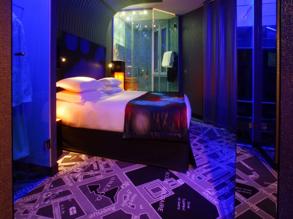Encore plus innovantes que les espaces communs, les chambres surprennent, dès la porte franchie. Surfaces vitrées pour la salle de bain et les placards, moquette avec motif plan de Paris, mobilier contemporain... Plus étonnant encore, les éclairages renforcent l'originalité : 3 ambiances colorées (fuchsia, vert, mauve), des points lumineux étoilés au plafond de la douche, de nombreux éclairages astucieusement placés.
