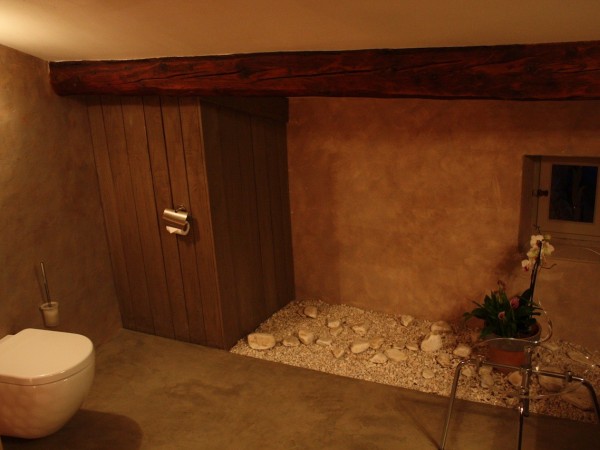 Les chambres sont donc sur les deux étages supérieurs de la maison. La première est prévue pour deux personnes, on y rentre au détour de l'escalier par une porte en bois, rustique. À l'intérieur, les lits-jumeaux et la décoration mélangent esprit traditionnel et style épuré avec une petite fenêtre donnant sur une partie du village et sur la vallée. Un escalier en colimaçon permet d'accéder à la salle de bain au style contemporain. Les deux autres chambres ont un style similaire. Elles peuvent accueillir en plus un ou deux enfants. Les salles de bain sont contemporaines et ouvertes sur les chambres.